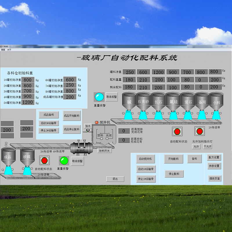1) 計量控制有手動、半自動及全自動運行方式,并可以隨時切換2) 玻璃自動化配料系統配方表:配方編號、配方名稱、原料桶號、原料名稱、計量重量,可存儲2000種以上配方